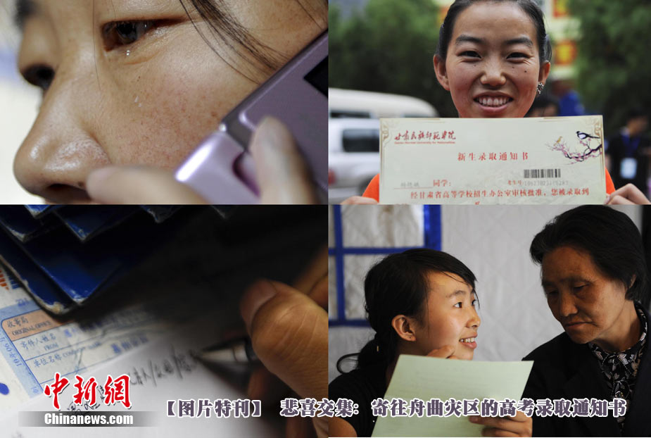 8月14日,甘肅舟曲災區的高考錄取通知書正在發放過程中,學生們接過火紅色的錄取通知書信封,眼里有藏不住的笑意。然而,有一些通知書卻永遠無法發出了。截至上午10點30分,舟曲一中收發室當天共發出7份錄取通知書,還有30多封正等待領取。中新社發 廖攀 攝