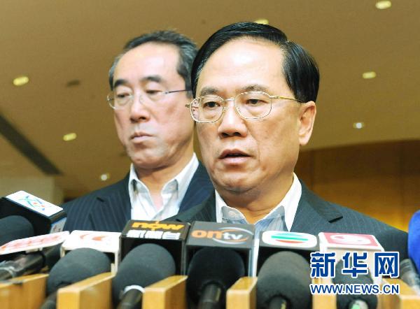 8月23日,香港特區行政長官曾蔭權(右)就菲律賓劫持事件會見記者。香港特區行政長官曾蔭權23日晚表示,對有香港游客在菲律賓劫持事件中遇害感到十分悲傷,對兇手冷血的行為感到憤怒!拔乙蛩纻呒覍僦乱宰钌钋械奈繂,特區政府會向傷者和家屬提供一些可能的協助,幫他們度過這個困難時刻。” 新華社發(李秋嬋攝)