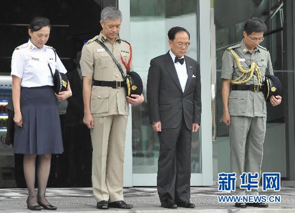 8月24日,香港特別行政區行政長官曾蔭權(右二)同政府官員為菲律賓人質事件中遇難的香港同胞默哀。當日,香港特區政府機構所有特區區旗下半旗,沉痛哀悼23日在菲律賓人質事件中遇難的香港同胞。 新華社發