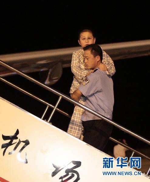 8月25日,一名警察將一名小傷員送上飛機。當日,南方航空公司一架包機將12位傷情較重的伊春空難傷員從伊春轉運到哈爾濱,接受進一步治療。 新華社記者邢廣利攝