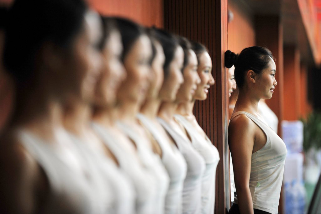 8月20日,南方醫(yī)科大學(xué)順德校區(qū),禮儀小姐背靠著墻練習(xí)站姿。