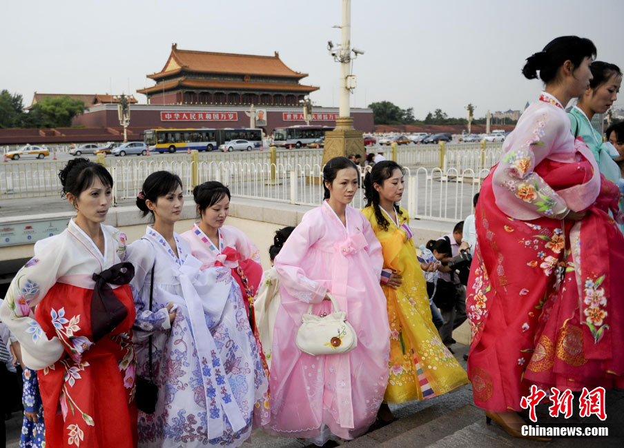 9月1日,朝鮮平壤藝術團的藝術家參觀天安門廣場。當日,朝鮮平壤藝術團在中國全國的巡演活動正式啟動,平壤藝術團將在上海世博、寧波、廣州、深圳、珠海、昆明、重慶、武漢等20多個城市巡演“怒放的金達萊”。中新社記者 廖攀 攝