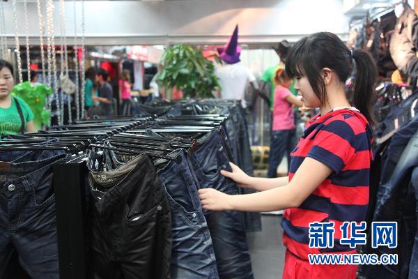 9月14日,在北京市大紅門一個服裝批發市場,顧客在選購牛仔褲。近期,受棉花價格上漲影響,以棉為主料的牛仔制品全面提價。據北京市大紅門一服裝批發市場商戶介紹,今年牛仔褲批發價格比去年同期上漲3.5%-5%,制作牛仔褲的普通布料每碼平均漲價2-3元。新華社發(劉爽 攝)