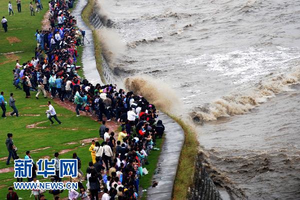 9月23日,游客在觀看錢塘江潮。當日是秋分節氣,又值中秋假日,眾多游客來到浙江海寧市鹽官觀潮景區觀看錢塘江潮。錢塘江大潮號稱“天下第一潮”,中秋前后是觀看錢塘江潮的最佳時機,每年都會吸引數十萬中外游客前來觀看。 新華社記者 韓傳號 攝