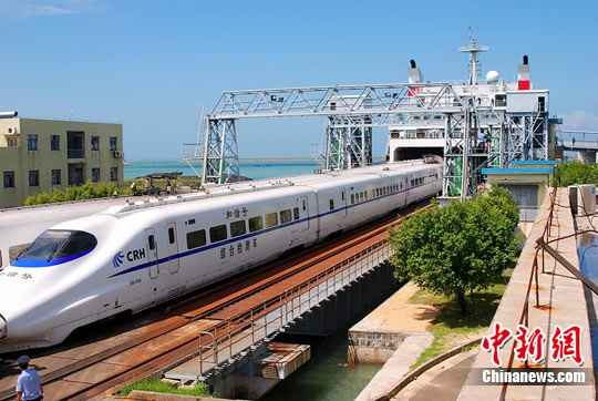 2010年10月14日,一列由內(nèi)燃機車頭牽引的CRH2-010A鐵路檢測專用動車組,從粵海鐵路南港碼頭緩緩駛下船,向海口火車站開去,標(biāo)志著我國“和諧號”動車組首次成功登上海南島。 實錄 攝