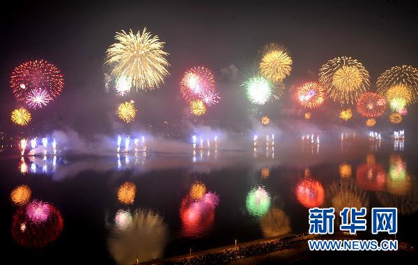 當(dāng)日,2010杭州西湖博覽會(huì)煙花大會(huì)在錢(qián)塘江與京杭大運(yùn)河兩個(gè)區(qū)域舉行,35萬(wàn)余發(fā)各類(lèi)煙花綻放杭州上空。 新華社記者王定昶攝
