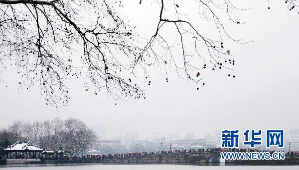 游人在浙江杭州西湖斷橋上觀賞雪景(2月18日拍攝)。