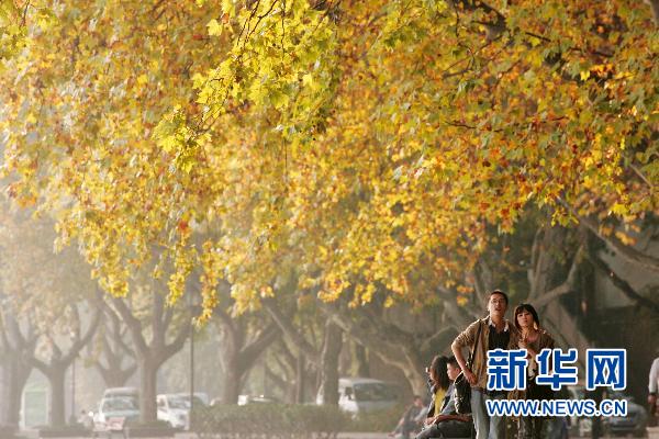 11月8日,在杭州西湖畔的北山路上,人們在滿樹黃葉下漫步。