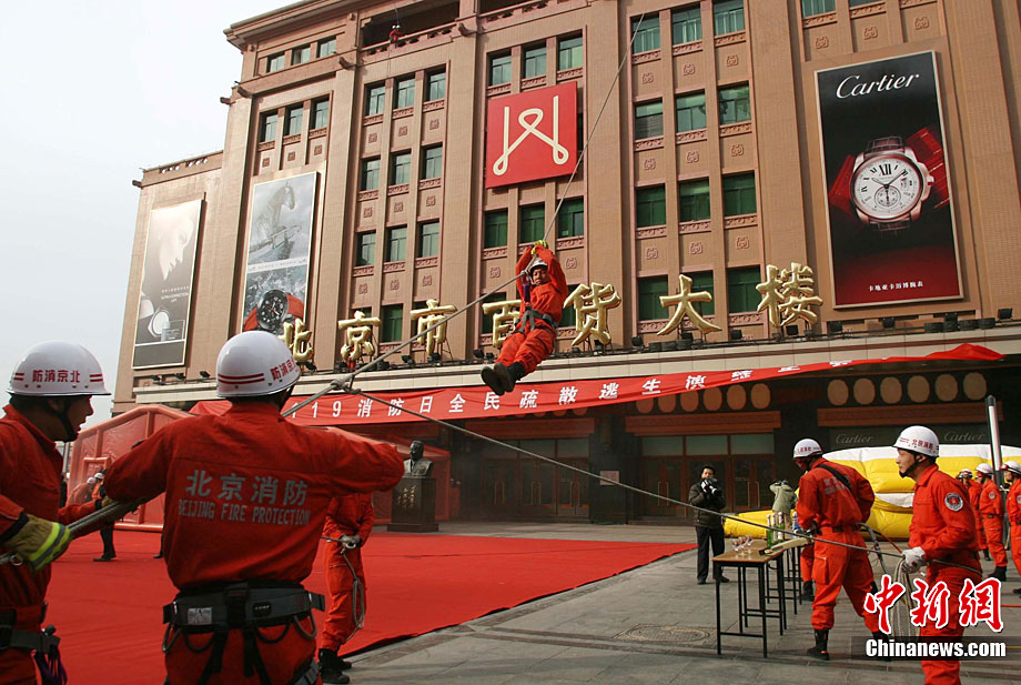11月9日,是中國消防宣傳日,公安部消防局在北京王府井百貨大樓進行“全民消防疏散逃生演練”活動。中新社記者 蘇丹 攝