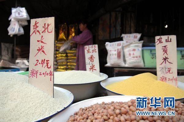 11月11日,在濟南市一農貿市場,糧店內標示著大米價格。當日,國家統計局發布數據顯示,10月份我國居民消費價格(CPI)同比上漲4.4%,漲幅比9月份擴大0.8個百分點。 新華社記者 郭緒雷攝