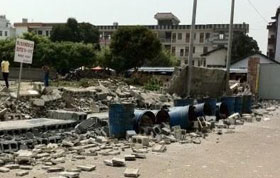 3月12日,駐滇集團(tuán)軍某團(tuán)戰(zhàn)士在盈江地震受災(zāi)最嚴(yán)重的勐町村拉勐寨拆除被毀房屋。