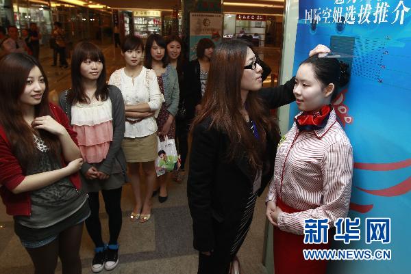 5月2日,工作人員在為一名選手測量身高。當日,由中國航空運輸協會等單位聯合主辦的首屆魅力天使國際空姐選拔推介大賽上海賽區第三次海選在豫園舉行。目前,已有3000多位報名者參與了海選階段的體檢、筆試、才藝表演和綜合評比。其中順利晉級,并在全國總決賽中獲得名次的優勝者將被推薦至國內各大航空公司從事空乘工作。新華社記者 裴鑫 攝