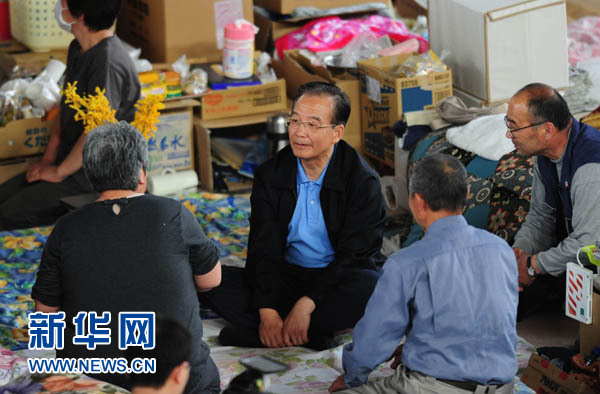 5月21日,中國國務(wù)院總理溫家寶在日本福島吾妻綜合運(yùn)動(dòng)公園體育館避難所慰問災(zāi)民。 新華社記者 季春鵬 攝