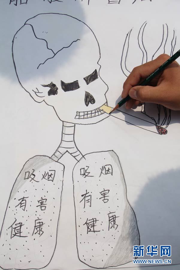 5月30日,在山東省臨沂市郯城縣未名中學,一名中學生創作禁煙宣傳畫,迎接5月31日世界無煙日的到來。 新華社發(張春雷 攝)