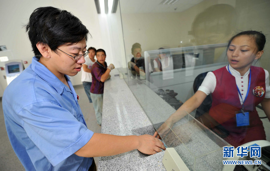 6月29日,一名乘客(左)在天津南站購票。當日,京滬高鐵沿線的天津西站和天津南站的售票廳正式啟用,兩個車站的配套設施也將陸續投入使用,靜待將于次日開通的京滬高鐵。 新華社記者岳月偉 攝