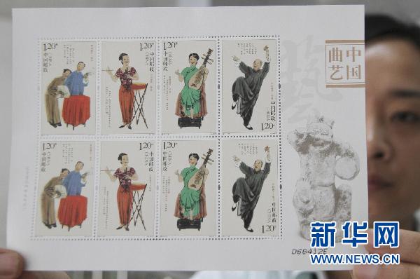 7月7日,河北省邯鄲市郵政局的工作人員展示即將發行的《中國曲藝》特種郵票(小版張)。 中國郵政將于7月8日發行《中國曲藝》特種郵票1套4枚、小版張1枚。4枚郵票分別以《相聲》、《鼓曲》、《評彈》、《快書》為主題,面值均為1.20元。 新華社發(王九忠 攝)
