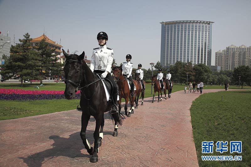 7月12日,女騎警在內蒙古包頭市銀河廣場執行巡邏任務。當日,內蒙古包頭女子騎警隊首次亮相,引來游人和媒體的關注。這支女子騎警隊于今年4月開始組建訓練,共有女騎警10名,平均年齡23歲。今后,她們將主要承擔指揮疏導交通、協助警務、大型活動禮儀警衛等任務。新華社發(李恩忠 攝)