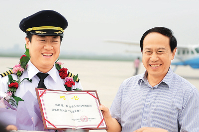 西安國家航空基地通用航空產業園授予陳瑋(左)2011中國國際通用航空大會“飛行大使”榮譽證書。 新華社記者 陳昌奇攝