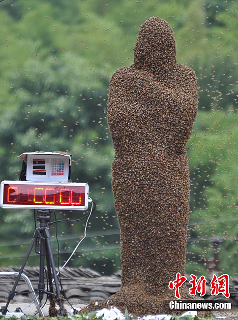 7月16日,湖南永州江華20歲的“蜂人”呂孔江與湖北宜昌秭歸42歲的“蜂人”王大林,在湖南邵陽虎形山進行吸附蜜蜂大賽。經60分鐘激烈角逐,王大林以26公斤的成績取勝呂孔江22.93公斤成績。中新社發 呂建設 攝 圖片來源:CNSPHOTO