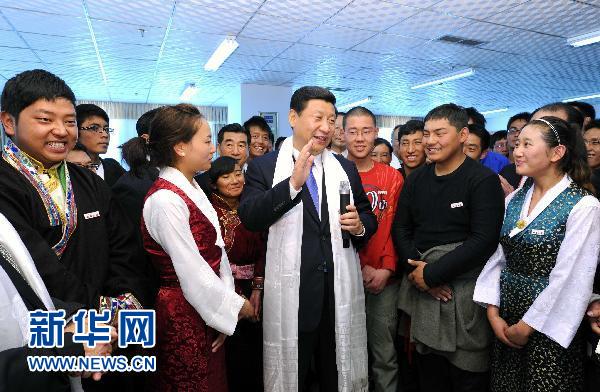 7月18日,出席西藏和平解放60周年慶祝活動的中共中央政治局常委、國家副主席、中央軍委副主席、中央代表團團長習近平在拉薩考察西藏大學,看望漢藏師生并同學生們親切交流。