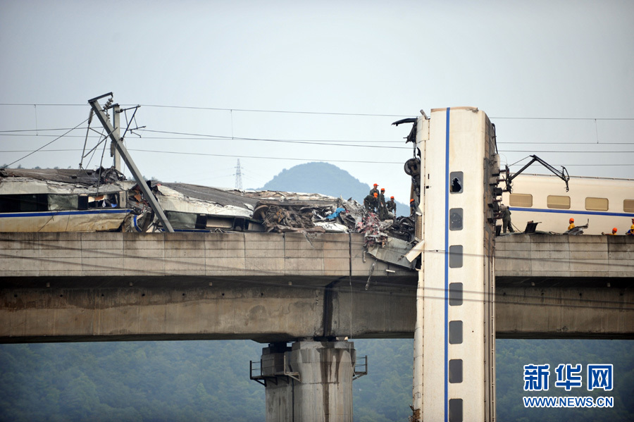 7月24日,救援人員和施工人員在清理事故現場。記者從浙江省政府應急辦最新獲悉,截至24日凌晨四點,兩列動車溫州境內追尾事故已造成32人遇難,受傷人數上升至191名,目前救援人員和施工人員正在清理事故現場。新華社記者 鞠煥宗 攝