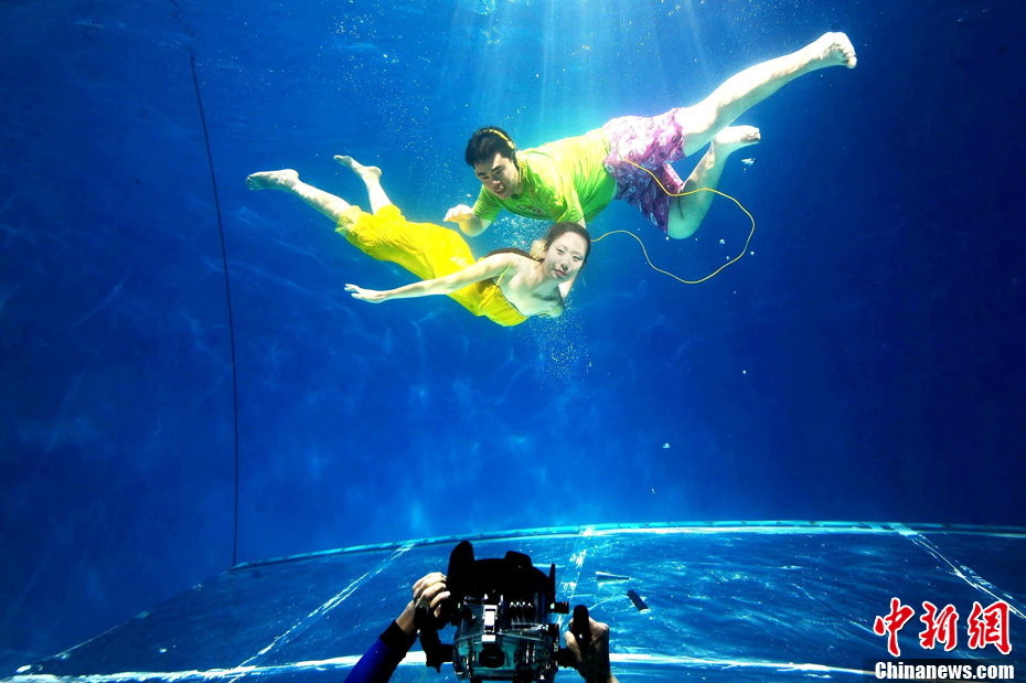 近日,不少追求個性、勇于“嘗鮮”的新人們來到北京首家水下攝影館拍攝水下婚紗照。雖然拍攝過程略感辛苦,但卻為新人們留下了難忘的拍攝體驗和甜蜜的愛情記憶。中新社發 李學仕 攝
