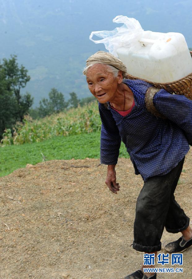 8月26日,南甸村大坪自然村70歲的吳華翠老人背水回家。今年2月至今,云南省昭通市大關縣遭遇罕見的春夏秋三季連旱,人畜飲水出現困難。在遠離縣城的偏遠山區天星鎮南甸村,分散居住在深山中的500多位村民家中的小水窖存水全部告罄,1500余頭大牲畜面臨斷水,村民只能到幾公里外的水源地背水。新華社記者陳海寧攝