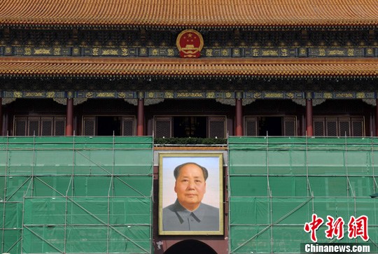 9月4日,北京天安門城樓搭起腳手架和防護網,正在接受墻體粉刷和維護。為迎接"十一"國慶節的到來,城樓外墻、兩塊標語牌、燈飾等都要進行檢修和測試。中新社發 侯宇 攝