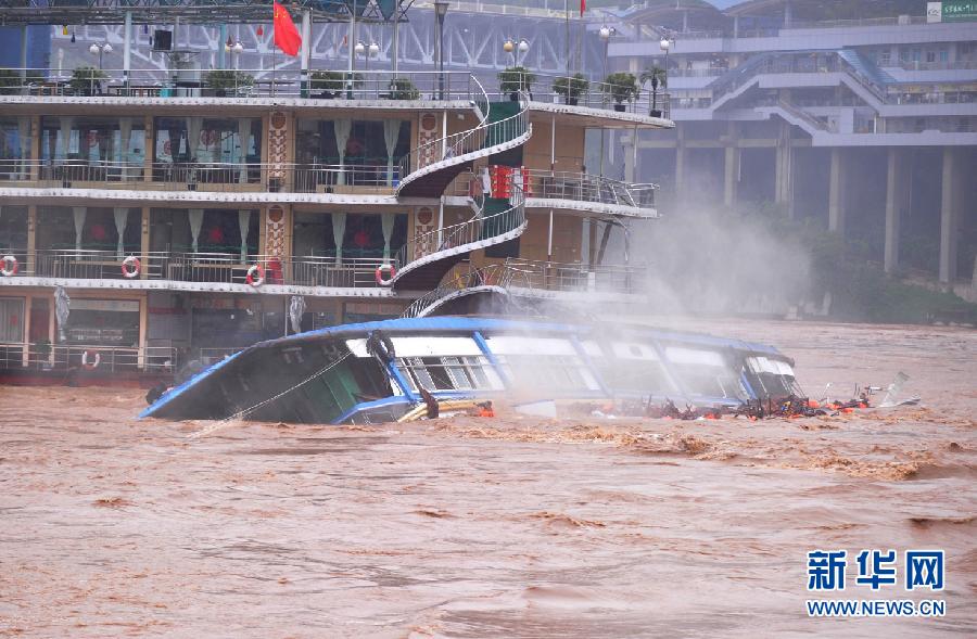 9月20日,餐飲船由于失去動力,不到2分鐘已經翻轉近180度。 9月20日16時許,受過境洪峰影響,嘉陵江重慶主城渝澳大橋水域一餐飲船舶翻沉,船上11人落水。重慶海事、消防等部門組織力量全力施救,目前已有9人被救起(1人自救上岸),余下2人正在進一步搜救中。新華社發
