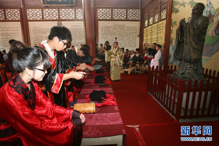 新華社照片,寧波(浙江),2011年9月21日 兩岸青年浙江奉化共行成人禮 9月21日,在浙江省奉化市孔圣殿,受禮青年叩拜孔子像。當日,“同根同源共享成長”2011兩岸青年成人禮在浙江省奉化市孔圣殿舉行,來自兩岸的56名優秀青年代表通過共同參加傳統成人儀式,升華對中華傳統文化的認知,感受中華文化的一脈相承、共融互通。新華社發(張培堅 攝)