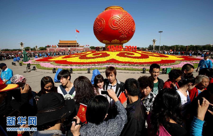 10月1日,游客在天安門廣場花壇前留影。國慶節當日,來自祖國各地的游客來到北京天安門廣場參觀,感受國慶節帶來的喜悅。 新華社發(李方宇 攝)