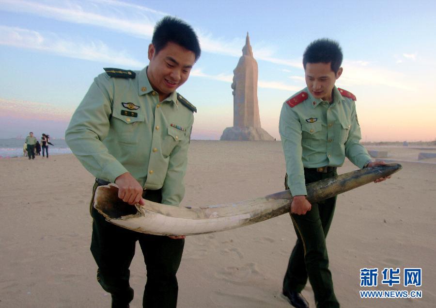 10月19日,邊防官兵把象牙帶回所里進行調查。當日,福建泉州邊防支隊衙口邊防派出所接獲群眾報警,在福建泉州市晉江衙口海邊發現一根象牙,隨后民警將這根象牙帶回進行調查。據測量,這根象牙長1.6米,直徑最大達14厘米。經初步確定,這根象牙為野生象牙。目前,邊防部門正對象牙做進一步鑒定,并調查其來源。 新華社發(李實 攝)