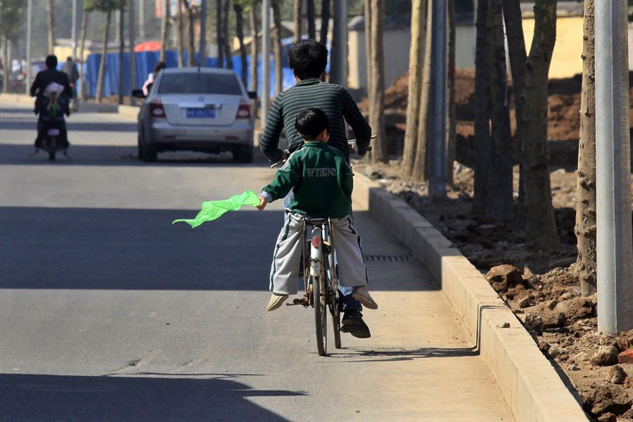 據介紹,學校委托制作紅領巾的廠家,設計了同樣大小的綠領巾,10月14日發放給沒有入隊的學生。學校九十多名一年級學生中,約有一半人都佩戴綠領巾。圖為一個孩子坐上家人的自行車,便將綠領巾摘下。