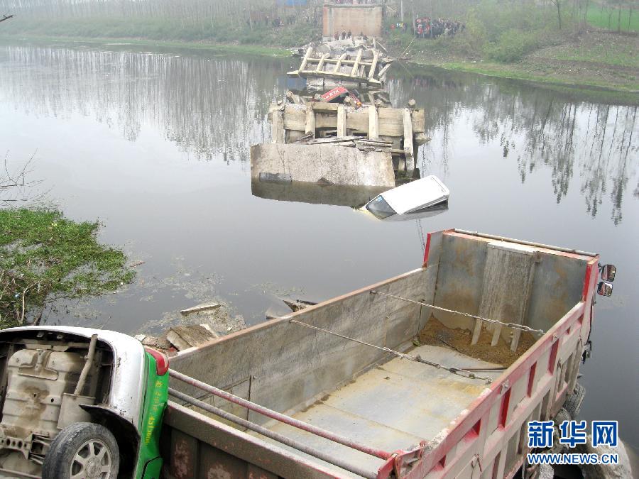 這是11月5日在河南省項城市拍攝的水新公路汾河橋坍塌事故現場。 當日早晨5時許,位于河南省項城市水新公路的汾河橋發生坍塌事故,造成4輛機動車落水,其中一輛是滿載沙子的貨運卡車。事故造成2人受傷。據了解,坍塌橋梁建于1977年,已被當地政府列為險橋,事故原因之一初步斷定為貨車超載。 新華社發(金月全 攝)