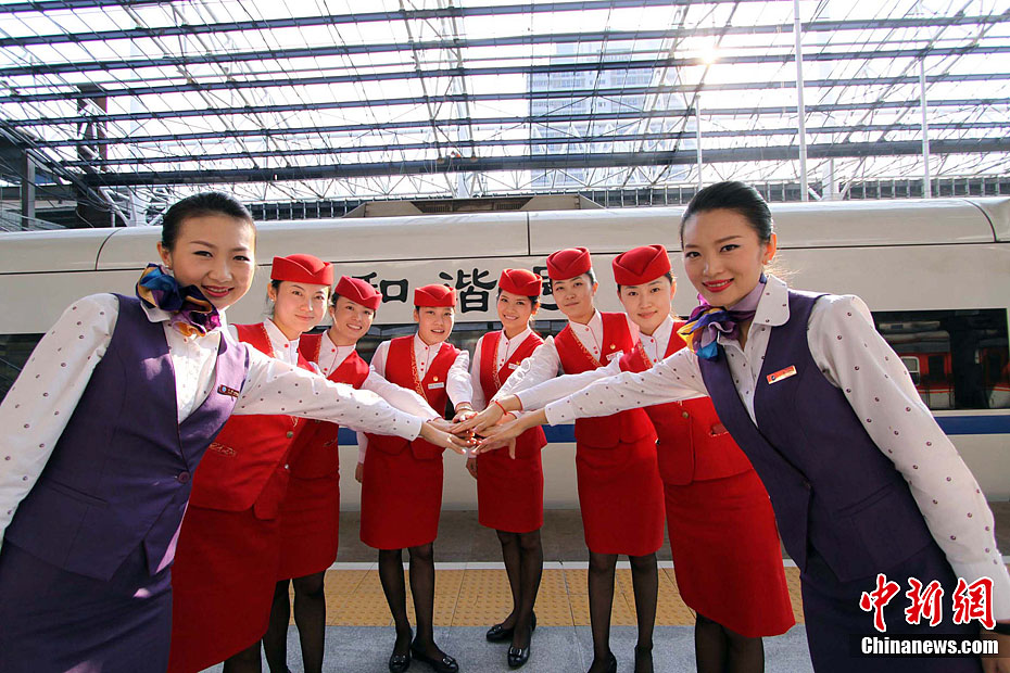 11月14日,一群青春靚麗的“空姐”登上福廈高鐵,與南昌鐵路局高鐵乘務員——“動姐”進行了一番經(jīng)驗和技巧的交流。圖為“空姐”“動姐”齊聚一堂,構成一道靚麗的風景線。雍萬俊 攝