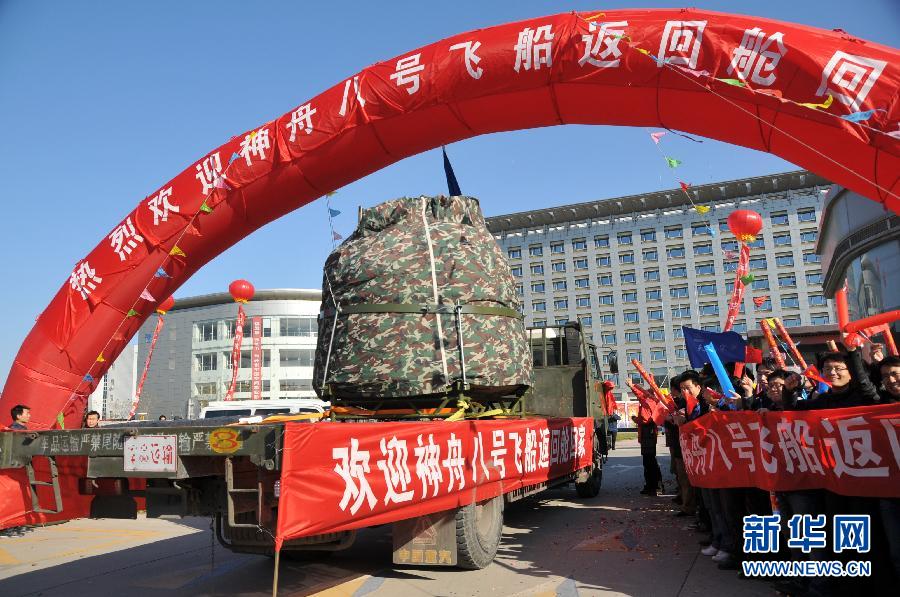 11月19日,神州八號飛船返回艙運抵北京航天城。當日上午,神舟八號飛船返回艙抵達北京昌平火車站,主著陸場區指揮部正式向飛船研制單位中國空間技術研究院交接返回艙。經初步檢查,返回艙外觀良好,燒蝕情況正常。 11月1日于酒泉衛星發射中心升空的神舟八號飛船,在先后兩次完成與天宮一號目標飛行器的完美對接后,于17日晚安全返回。這也標志著我國擁有了標準的天地往返運輸能力。新華社發(趙薇 攝)
