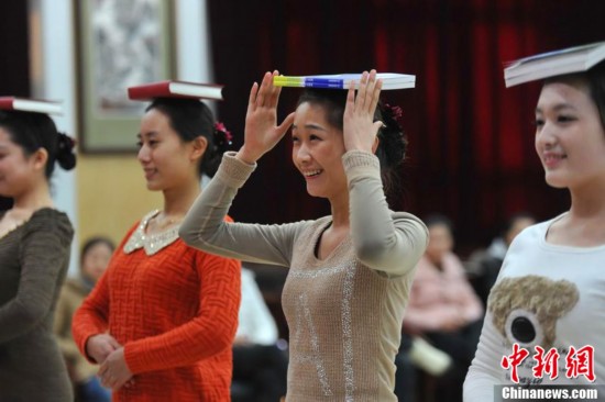12月24日,北京站備戰(zhàn)春運(yùn),對(duì)新上崗的員工進(jìn)行培訓(xùn)。圖為頭頂書(shū)本,保持姿勢(shì)不變,書(shū)不能落下。