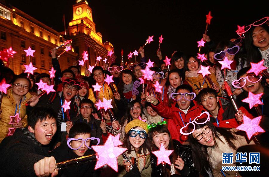 2012年1月1日零時許,市民和游客在外灘金融廣場慶祝新年的到來。 2011年12月31日晚,一場以3D燈光秀的形式演繹迎新倒計時活動在上海黃浦江畔激情上演。活動現場上海外灘金融廣場與紐約、倫敦、巴黎、東京、悉尼等世界著名國際大都市實時聯動。上海市中心城區多處同時舉行辭舊迎新聯歡活動,人們在濃濃的喜慶氛圍中迎接2012年的到來。新華社記者 裴鑫 攝