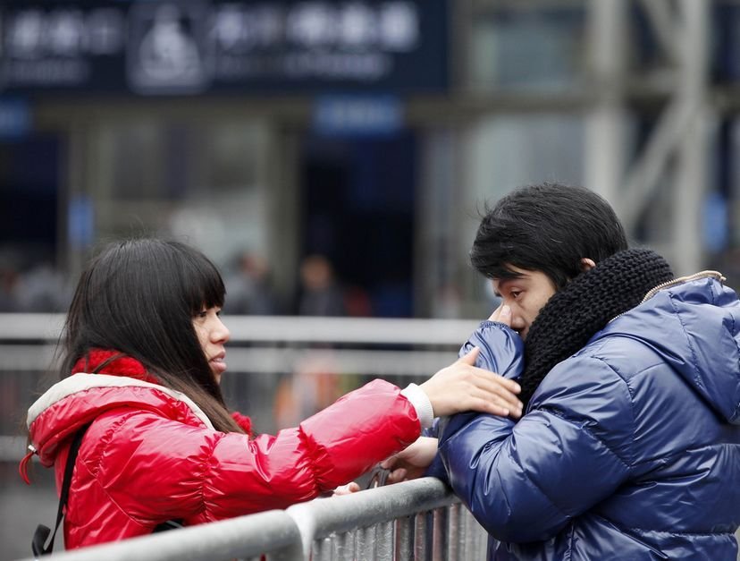 2012年1月8日,上海,火車站吻別的情侶。上海鐵路局春運(yùn)首日發(fā)送旅客超過80萬人,在鐵路上海站南廣場(chǎng)驗(yàn)票大棚通往安檢口區(qū)域的東西兩側(cè),已經(jīng)用半人多高的金屬護(hù)欄圍了起來,這里成為戀人“吻別”選擇地,在寒冷的冬日里,形成了一道獨(dú)特的風(fēng)景線。(王炬亮/攝)