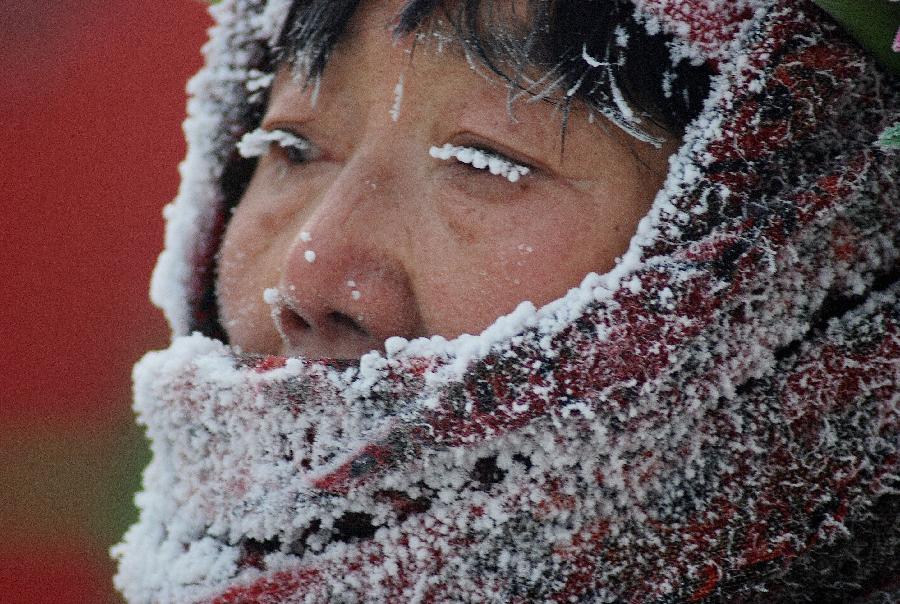 1月30日,在內蒙古牙克石市街頭,一名市民的帽子、眼睫毛上結滿冰霜。