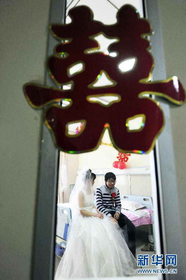 2月14日,新人丁金杰、李海麗在暫時改做新房的病房內(nèi)等待婚禮的開始! ‘斎帐乔槿斯(jié),在山東省千佛山醫(yī)院腎內(nèi)科病房,身患尿毒癥的丁金杰與愛妻李海麗的新婚典禮隆重舉行。丁金杰與李海麗今年同是26歲,二人在大學相知相戀,并于2011年6月登記結(jié)婚。當年9月,丁金杰在醫(yī)院查出身患尿毒癥,只能換腎才能挽救生命,然而二人的家境難以承擔巨額醫(yī)療費用,只能暫時靠一周三次的透析維持丁金杰的生命。面對噩耗,李海麗依然不離不棄,鼓勵丁金杰接受透析治療,并堅持要與他舉行婚禮。看到一對年輕人的真摯情感及考慮到丁金杰的病情,醫(yī)院在情人節(jié)當天為二人舉辦了一場特殊的病房婚禮,以見證這場“不拋棄、不放棄”的人間真愛! ⌒氯A社發(fā)(崔健 攝)
