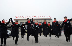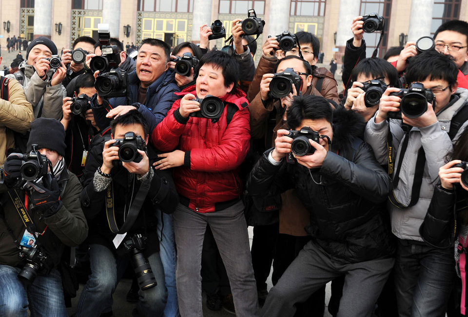 【“看這里,看這里”】3月5日,人大會議開幕,記者在廣場上追堵拍攝代表。(廣州日報)