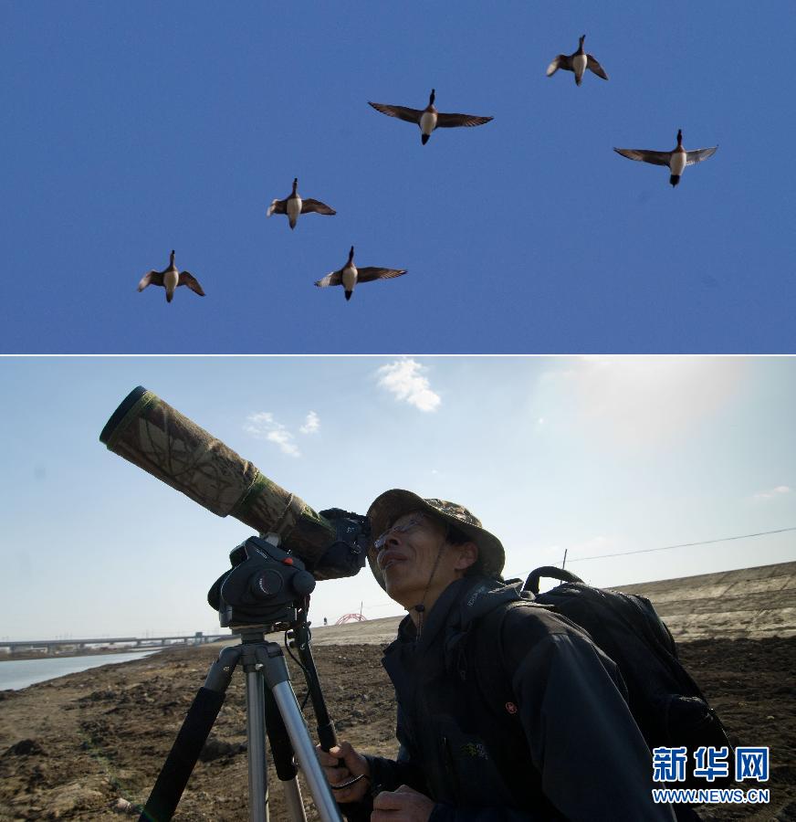 一位觀鳥愛好者在吉林長春西湖邊拍攝(上圖);一群野鴨在長春西湖上空飛翔(下圖)(拼版照片,4月3日攝)。