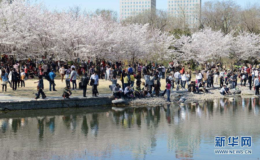 4月8日,游客在玉淵潭公園觀賞盛開的早櫻。本周末開始,北京玉淵潭公園的早櫻進入最佳觀賞期。放眼望去,花開似緋云絳雪,層層疊疊,美不勝收。據了解,玉淵潭公園櫻花大體分為早櫻和晚櫻兩大系列,因品種不同,次第開放可持續一個月。新華社記者李俊東攝