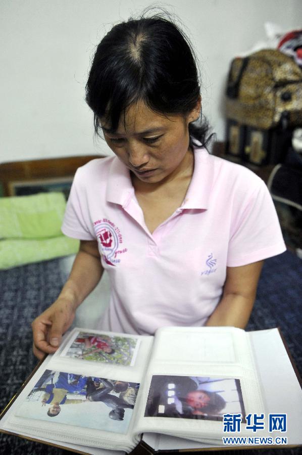袁德珍在住所翻看兒子的相片(5月22日攝)。這幾天,在微博上熱傳著一個動人的故事:在經歷半年內接連失去丈夫和兒子悲痛煎熬后,一位在深圳打工的40歲的母親做出了一個艱難的決定:將自己腦死亡的11歲兒子田干的所有器官及遺體捐獻出來。5月13日母親節(jié)當天,在廣州中山大學附屬第一醫(yī)院進行的器官捐獻移植手術中,小田干留下的器官和眼角膜使5人得到了及時救治。新華社記者 陳曄華 攝