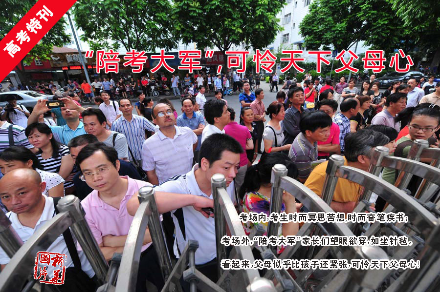 家里,路上,考場……一切其他的活動都在為高考讓路。考場內,考生時而冥思苦想,時而奮筆疾書;考場外,“陪考大軍”家長們望眼欲穿,如坐針氈?雌饋,父母似乎比孩子還緊張,可憐天下父母心!