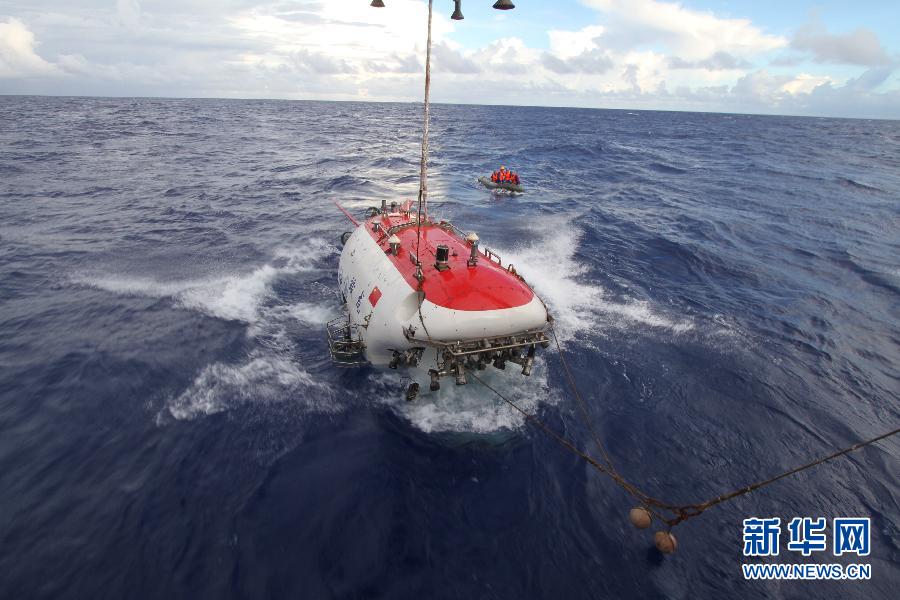 6月19日,“蛟龍”號被布放入水。當日,我國“蛟龍”號載人潛水器進行7000米級海試第二次下潛試驗。據了解,第二次下潛試驗是“蛟龍”號7000米級海試中非常關鍵的一次試驗,主要任務是復核潛水器在第一次下潛試驗中故障排除的效果,繼續驗證潛水器在6000米深度的各項功能和安全性。潛水器攜帶了海水取樣器、生物采樣籃、標志物等多種設備,以便進行海底作業。新華社記者 羅沙 攝