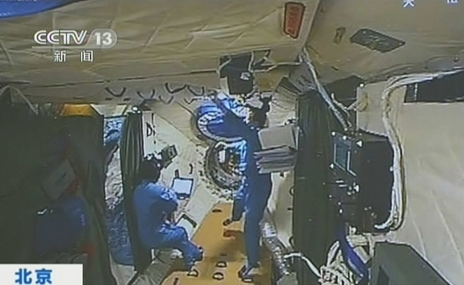 6月19日15時46分,神舟九號航天員飛行乘組成功接收地面第一封電子郵件。首次開展的天地電子郵件傳輸試驗獲得成功。據(jù)悉,3名航天員從18日23時開始執(zhí)行天地同步作息制度,目前狀態(tài)良好。(電視截圖)