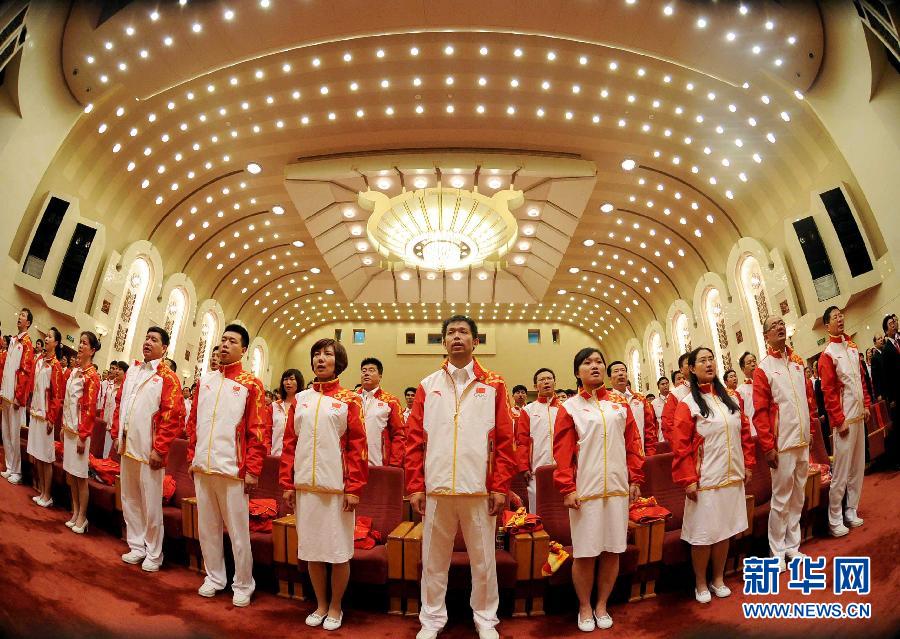 7月10日,代表團成員在成立大會上唱國歌。當日,倫敦奧運會中國體育代表團在北京成立。中國體育代表團由621人組成,其中運動員396人,他們將參加23個大項、212個小項的比賽。新華社記者公磊攝