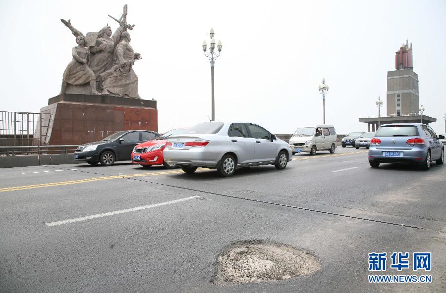 7月17日,一些車輛從南京長江大橋橋面出現的坑旁經過。 近日,南京長江大橋橋面出現眾多大小不一的坑,有的坑深約7至8厘米,有的坑直徑約50厘米,給過往車輛帶來不便。 新華社發